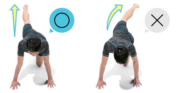 お尻や太もも裏の筋肉を使って脚をまっすぐ伸ばしましょう。お尻などがサボると斜めに傾いてしまうので注意です。