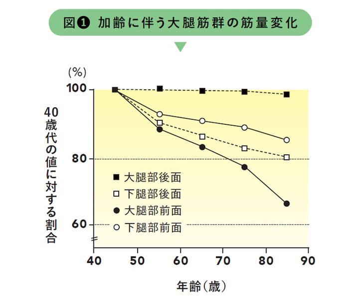 また、よく「歳をとると体が動かなくなる」ということを耳にしますが、この原因の一つは筋肉の衰えにあります。筋肉量は20代をピークに減少していくことがわかっています。とくに40代からの減少はいちじるしく、筋力の低下を感じる場面も増えてくるはず。下の図1によると、大腿四頭筋(太ももの前にある筋肉群)は年1%も減少しています。