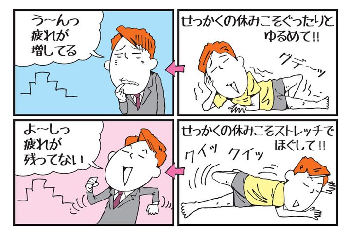 硬くなった筋肉は、放っておいてもほぐれません。たとえば平日はデスクワークで1日中猫背だったとして、疲れたからと休日まったく動かずに家で過ごしていると、平日と同じような座った姿勢で休日も過ごしてしまうことになります。これでは、筋肉にとって平日も休日もない状態と同じ。硬くなった筋肉は硬いままであり、仕事の疲れは解消されづらいのです。
