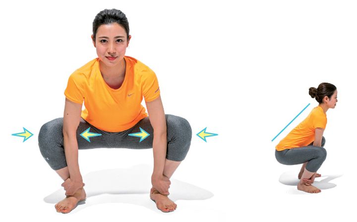 ヒジでヒザを外側に押しながらお尻を落とします。体が硬い人はできる範囲内でOKです。写真右のように、背すじを伸ばすことで内ももにも効果があります。
