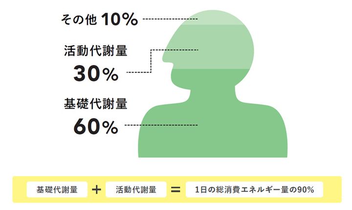 「基礎代謝」とは、人間が生きていくために最低限必要なエネルギー量のことであり、部屋で寝ているだけでもこのエネルギーは消費されます。1日の総消費エネルギー量の60%程度を占めています。