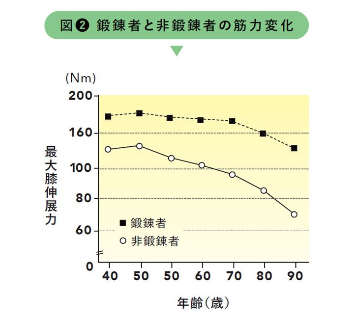 つまり、今30歳の人は80歳になったとき、太ももの太さは半分になっているということ。しかし同時に、トレーニングをすることでその減少率が軽減されることもわかっています(図2)。