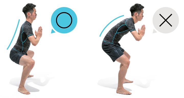 股関節を曲げて姿勢をキープし、足を着地させたらヒザを深く曲げて、お尻をできるだけ落としましょう。