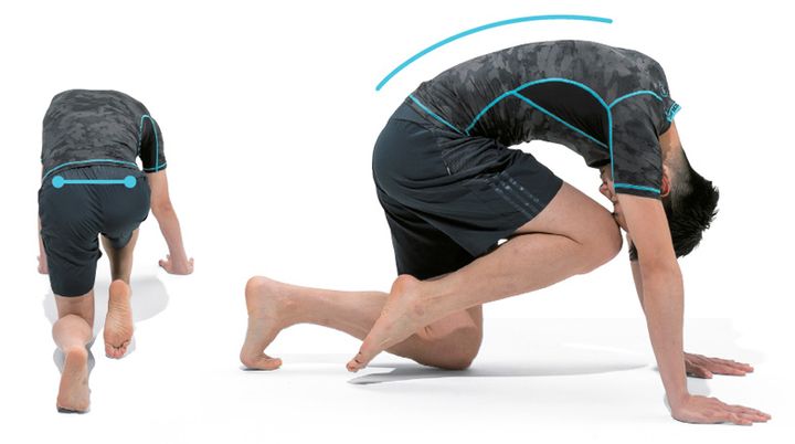 股関節の前後の筋肉を動かすことが狙いです。1のポーズでは、お腹側の筋肉を使いながら脚を引き寄せることで、背中側の筋肉が伸びます。逆に2のポーズでお尻の筋肉を使いながら脚を伸ばすことで、お腹側の筋肉が伸びます。この動作を交互で行えば、腰まわりも改善されていくでしょう。骨盤は傾けずまっすぐに保ちましょう。