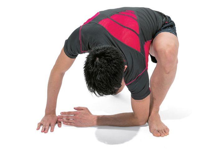 ヒザを軽く曲げながら、お尻を突き出すようにして上体を起こします。猫背にならないように姿勢を正しましょう。