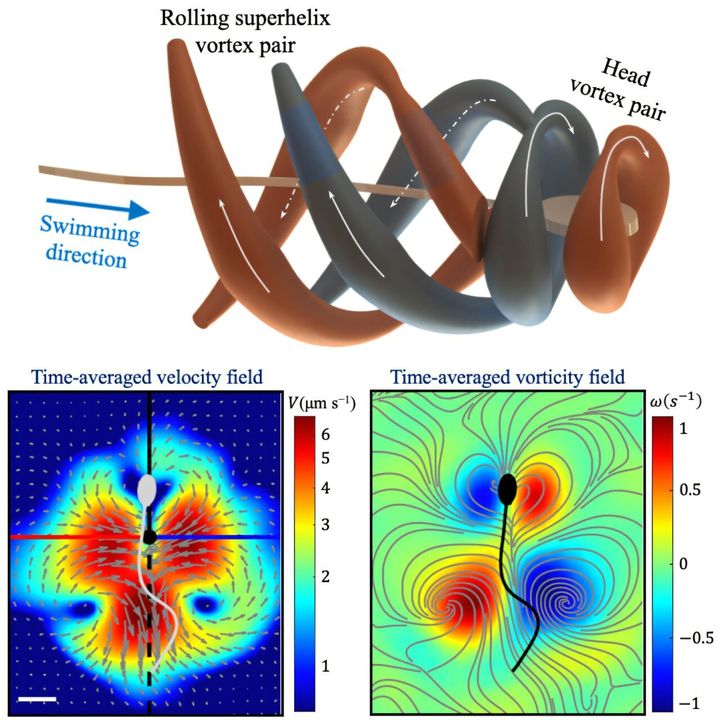 鞭毛の動きによって周囲の体液に渦が生まれ、コルク抜きのようにねじれた流れが、精子の後ろや周囲に形成されていました。