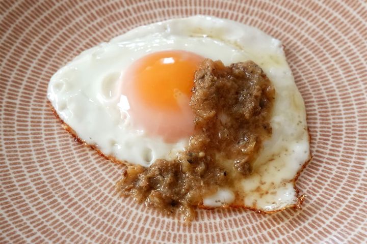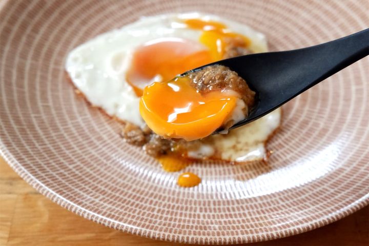 最後は半熟の目玉焼きにかけてみました。フライパンにサラダ油小さじ1/4を弱めの中火で熱し、卵を割り入れます。白身が半分固まったら水小さじ1を入れてフタをし、1分加熱して、黄身が好みの半熟になったら皿に移します。旨いわしを上から小さじ1かけました。