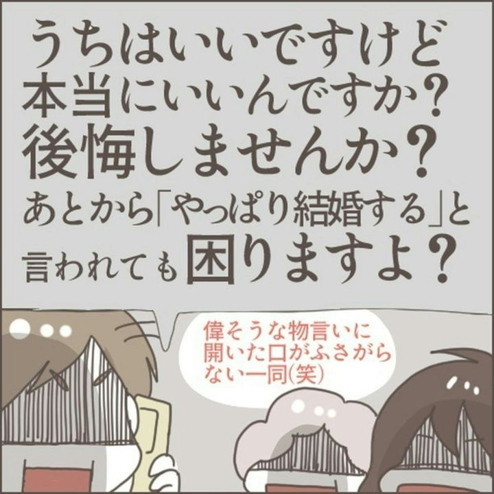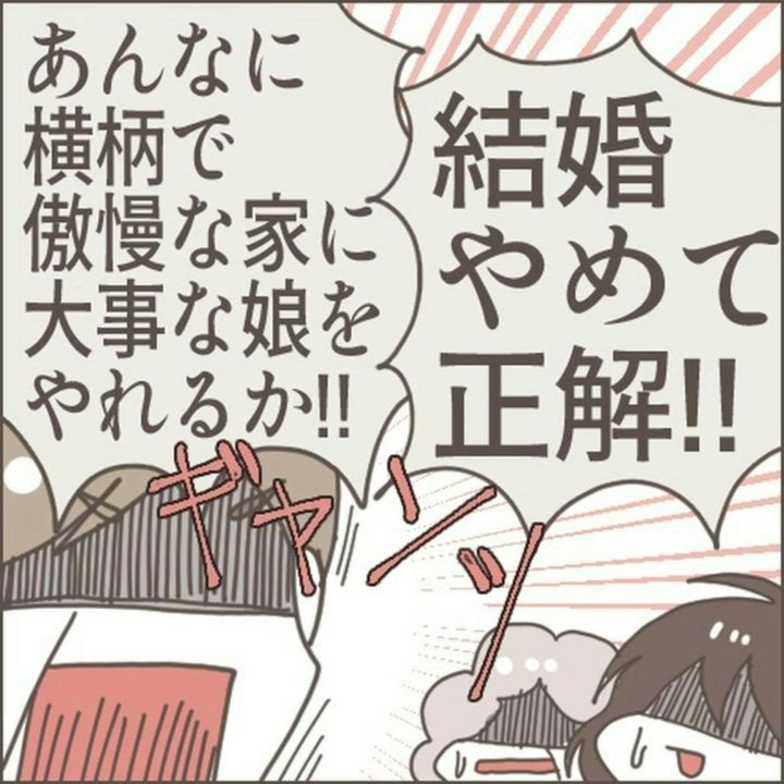 マサヒロのことが大好きで、結婚したいと考えていたリンさん。ところが、両家の顔合わせの席は最悪なものでした。終始、リンさんの両親をバカにするような態度だったマサヒロの両親を許せないと感じていました。また、結婚するなら祝福して欲しいと考えていたのですが、今の状況では無理そうです。
