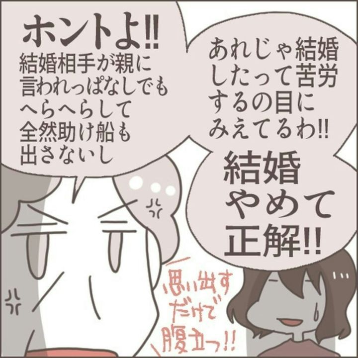 本作では、クセが強い彼の両親のせいで、破談となってしまった体験談が描かれています。マサヒロの両親は、とても失礼ですよね…。リンさんの両親が怒って当然です。とはいえ、相手の親の非常識さに、結婚前に気づくことができた点はよかったです。「このまま結婚していたら…」と思うと、おそろしいですね…。