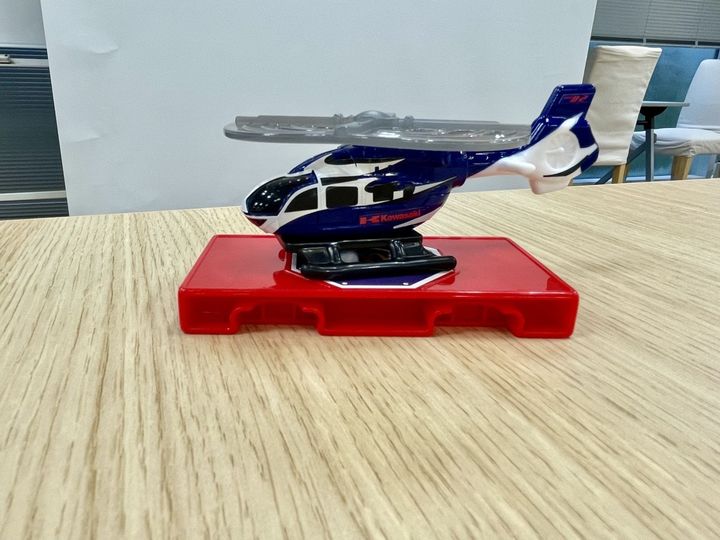 ハッピーセットトミカでは初登場となるヘリコプター。ローターを手で回すことができ、背景パーツにはマクドナルドのロゴが描かれています。青と白のツートンがかっこいいヘリコプターは遊びの幅が大きく広がりそう。