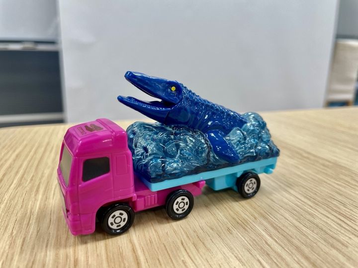 見た目にもインパクト抜群な搬送車は手で押すと恐竜の口が開き、車体の下から光を当てると荷台のクリアパーツが点灯して見えるようになっています。絶滅してしまったモササウルスですが、こんな形で見ることができるとは。これは子どもだけでなく、大人も欲しくなってしまいますよね。