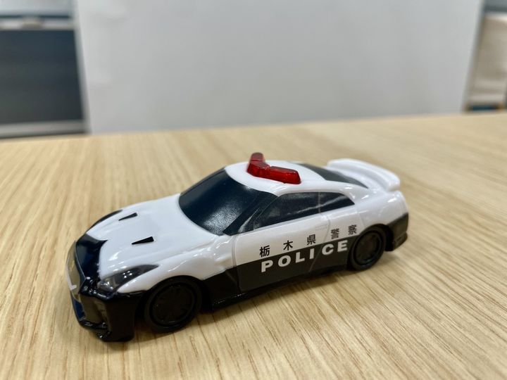 栃木県警と書かれたかっこいいパトカーは憧れの1台。手で押すと赤色灯が光って見え、車体の下にスマートフォンなどで光を当てるとフロントライトが点灯して見える本格派です。