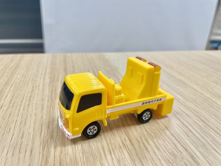 道路の工事や事故の時に通行車両に情報を伝える標識車は角度によって背面のモニターの絵が工事中/渋滞と入れ替わって見えるようになっています。さらに、車体の下から光を当てると前の黄色のライトが点灯して見えるようになっており、大型車両が好きな子にはたまらないおもちゃになっています。