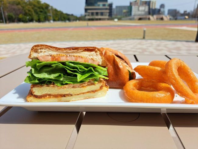 「豆腐ステーキハンバーガー」のレギュラーとオニオンリング(1,200円)をチョイス。ソースもケチャップ・テリヤキ・バーベキュー・チポトレ(スモーキーな香辛料)・ピーナッツバターの5種から、ピーナッツバターを選びました。店内でも食べられますが、テイクアウトなら専用ボックスに入れてくれます。