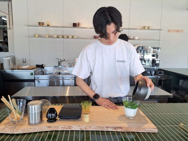 ふわっふわのパンケーキが人気の「MICASADECO THE PARK」でぜひ味わって欲しいのが、カウンターで抹茶を点ててくれる「濃厚抹茶ラテ」です。「少し経験はありましたが、練習しました」と、手際良く仕上げていたお兄さん。カウンターの緑色は目の前に広がる芝生と合わせているそうで、ナチュラルな落ち着きを感じました。オープン後しばらくは20:00(LO19:00)までですが、今後はディナー営業も予定しているそうで、ディナーメニューも気になるところです。