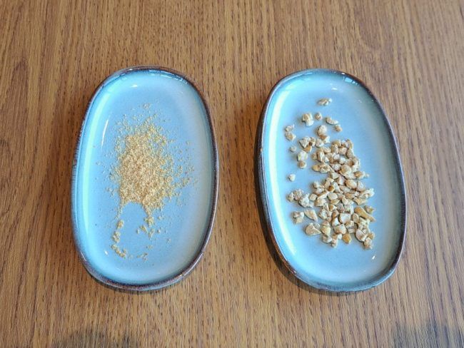 3種の納豆ご飯がセットになった「豆三彩(まめさんさい)」1,250円や、8種の納豆ご飯から1種を選ぶ「発酵豆御前」1,480円~のほか、サラダとお吸い物に〆リゾットまで付いた「納豆カルボナーラセット」1,480円、こな納豆とドライ納豆をトッピングした「こなっとうそふとくりぃむ」550円など、食べてみないと味が想像できないメニューも。ソフトクリームは納豆感がなく食べやすいそうなので、納豆が苦手な人もチャレンジしてみて。発酵豆御前の1品「和牛トロフレーク 青ネギ」をいただきました。