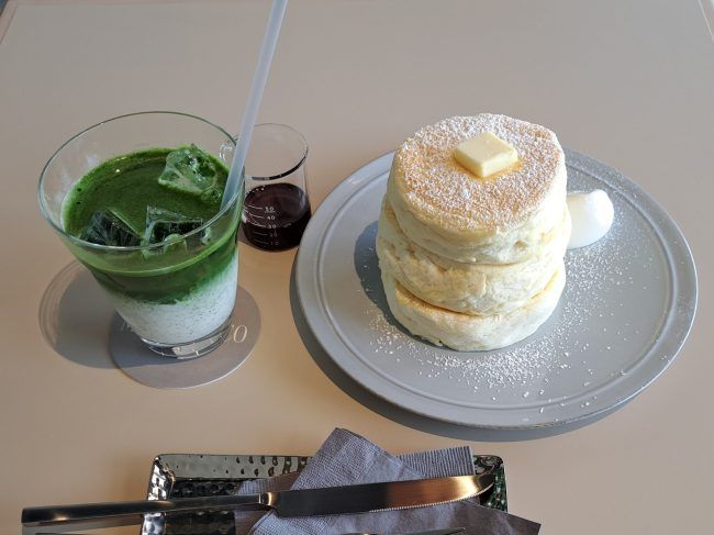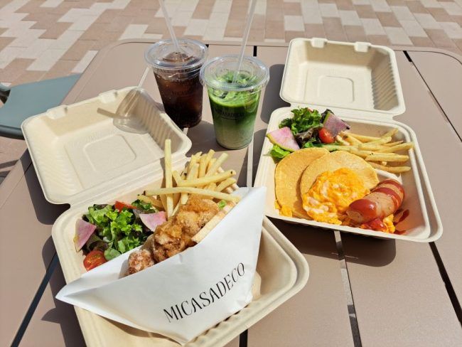 「濃厚抹茶ラテ」700円と、一番人気の「ふわふわリコッタパンケーキ」1,750円をいただきました。きび糖シロップにミルクを加えたラテは、甘すぎず抹茶の香りが引き立ちます。ミルクはオーツミルクやアーモンドミルクに変更もOK。大阪城公園に近く、海外からの観光客を意識して、ビーガン対応が可能なのだそう。しっかり苦みの効いたおいしい抹茶ラテでした。パンケーキやドーナツ、ピタパンなどはテイクアウトもOK! 写真下はテイクアウト用の「ピタサンドセット」(左)1,850円、もちもちの「パンケーキブランチセット」(右)2,000円。
