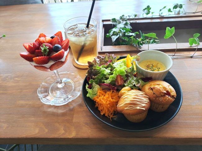 メニューは多国籍ランチやスパイスカレーを用意。ソフトクリームやケーキセットなどのスイーツも揃います。