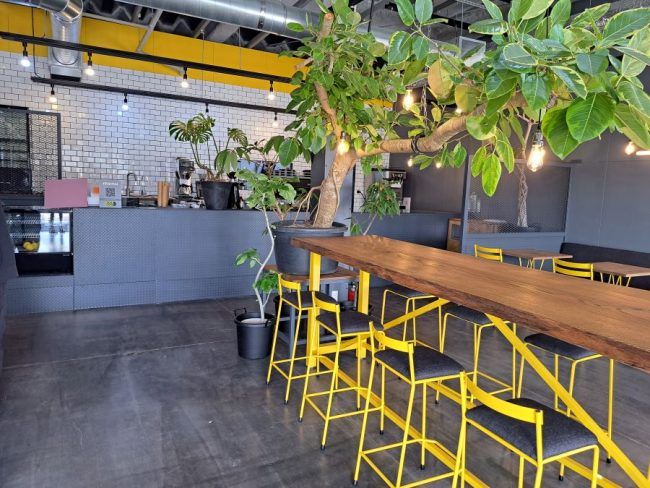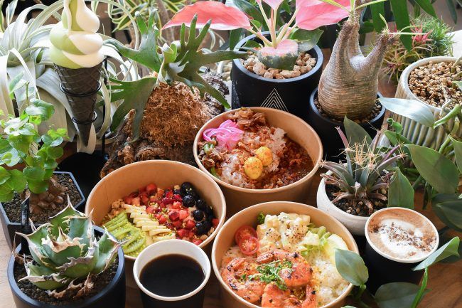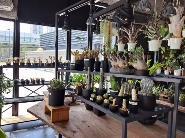家具×植物×カフェがコンセプトの「SULK GREEN CAFE」に入ると右側に植物スペースがあり、サボテンなど多種多様な鑑賞用植物が所狭しと並んでいました。見たことのない独特なフォルムにくぎ付け! 多肉植物を株分けをしていたスタッフが、育て方などを詳しく説明してくれました。店内の家具もスタイリッシュですね。