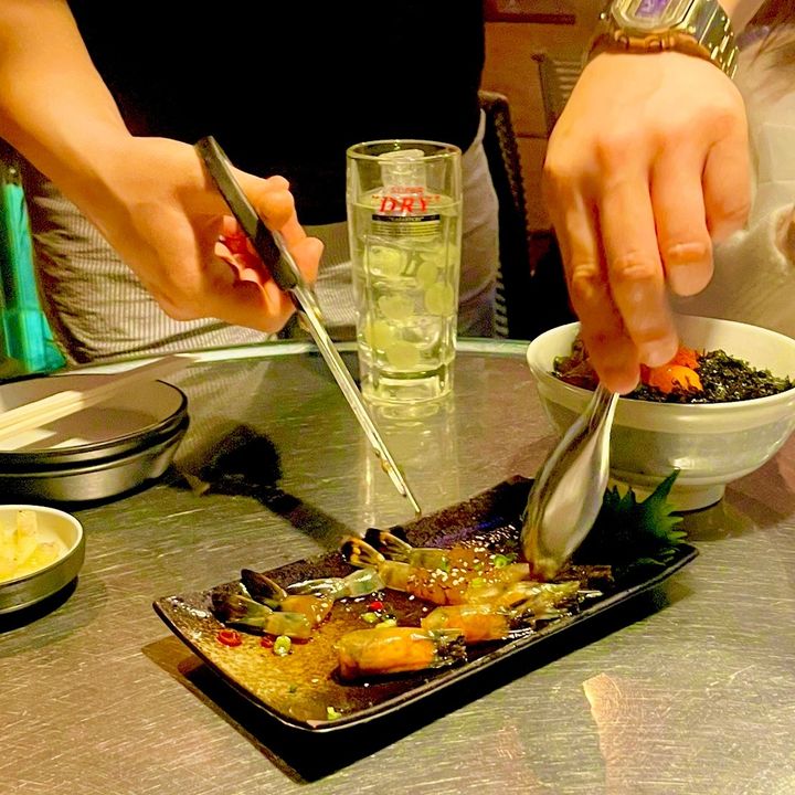 スルパンでぜひ頼んでほしい一品が、カンジャンセウ(醤油漬け生海老)。韓国でも人気の高いこのメニュー、スルパンではなんと店員さんが目の前で最後まで丁寧に仕上げてくれるスタイル。