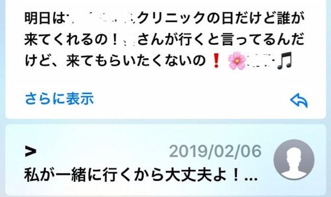 私が仕事終わりにメールチェックをすると、翌日の付き添いを確認するメールが届いていました。どうやら、私がパニック状態から落ち着かせようと必死になだめたことも、姉が電話を入れてくれたことも忘れている様子。
