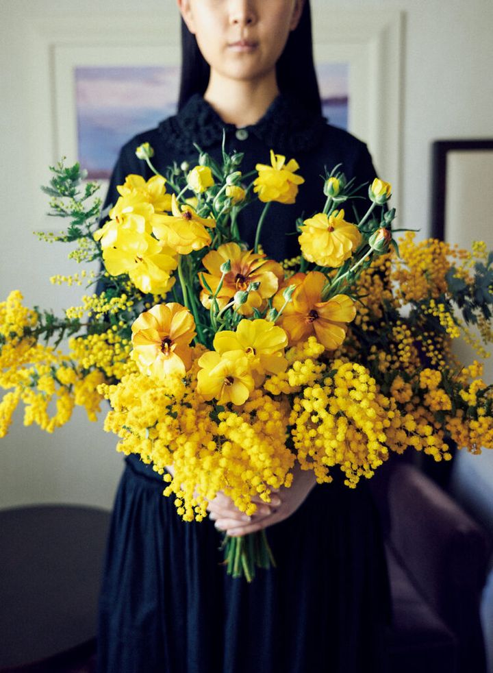 『ル・ベスべ』の松岡龍守さんが選んでくれた今月の花は、房状に小さな丸い花を咲かせるミモザ。つやのある花弁が印象的なラナンキュラスのラックスと合わせて、春の陽気を思わせる温かな色合いのブーケに。「ミモザといえば、3月8日の国際女性デーに女性へ贈るイメージがありますが、特に盛んなのはイタリア。その時季になると街中に飾られ、カフェに入ったりすると、短い枝を1本さらっとコップに挿していたりして素敵なんですよね。大ぶりな枝を何本かどさっと生けてもいいですし、ラックスのように茎が細く柔らかい花を添えると、流れが出てナチュラルな雰囲気になりますよ」(ル・ベスべ 03−5469−5438)