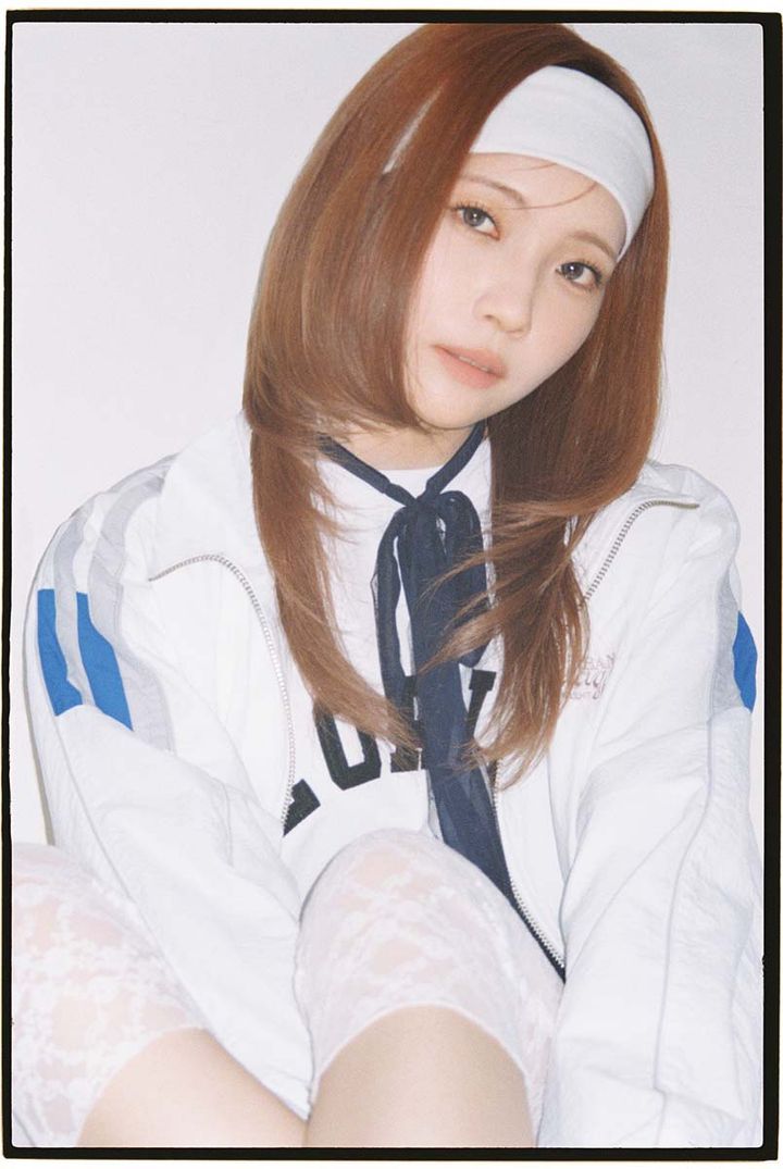 ナイロンジャケット¥11,990/ACLENT、中に着たTシャツ¥7,590/チャンピオン(ヘインズブランズ ジャパン カスタマーセンター)、スカート¥8,690/エモダ(エモダ ルミネエスト新宿店)、レースレギンス¥14,300/プロヴォーク(ジャック・オブ・オール・トレーズ プレスルーム)、リボンチョーカー¥4,950/ジユウバイラベルエチュード(アンティローザ)、ヘアバンド¥880/アネモネ(サンポークリエイト)、リング¥30,800/ラムダ