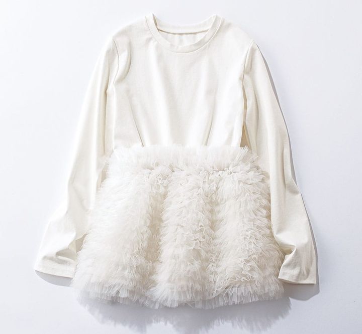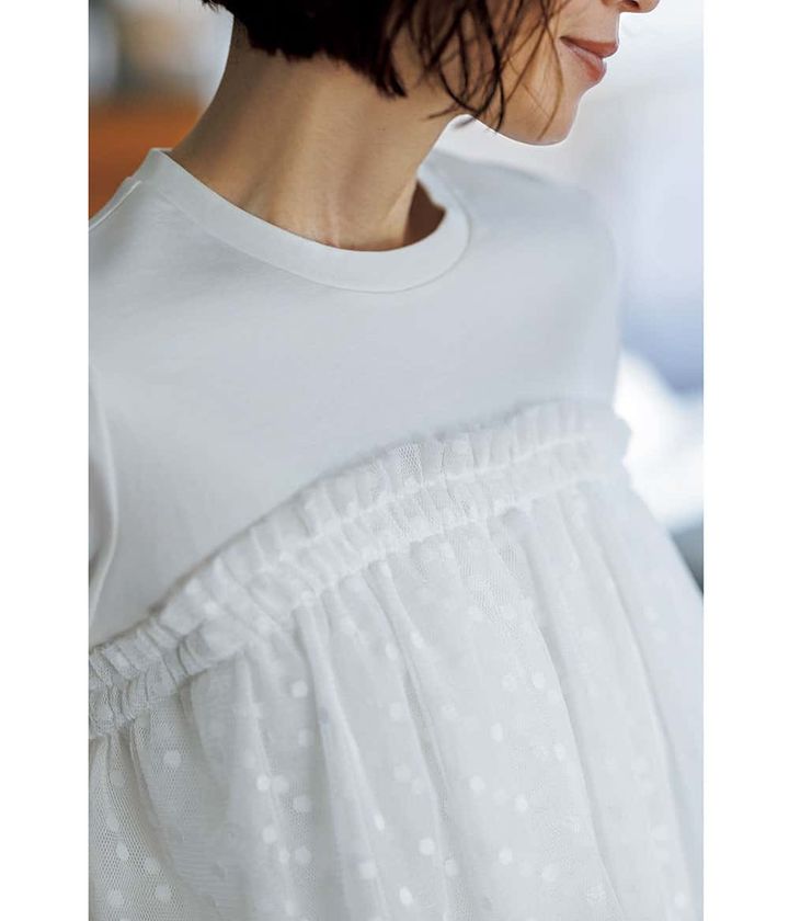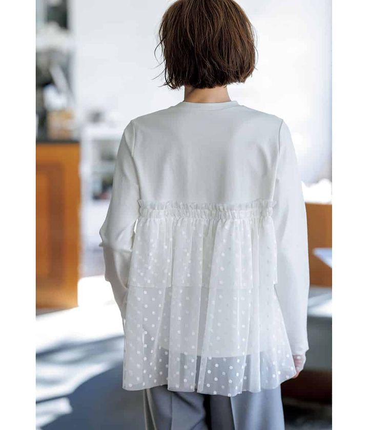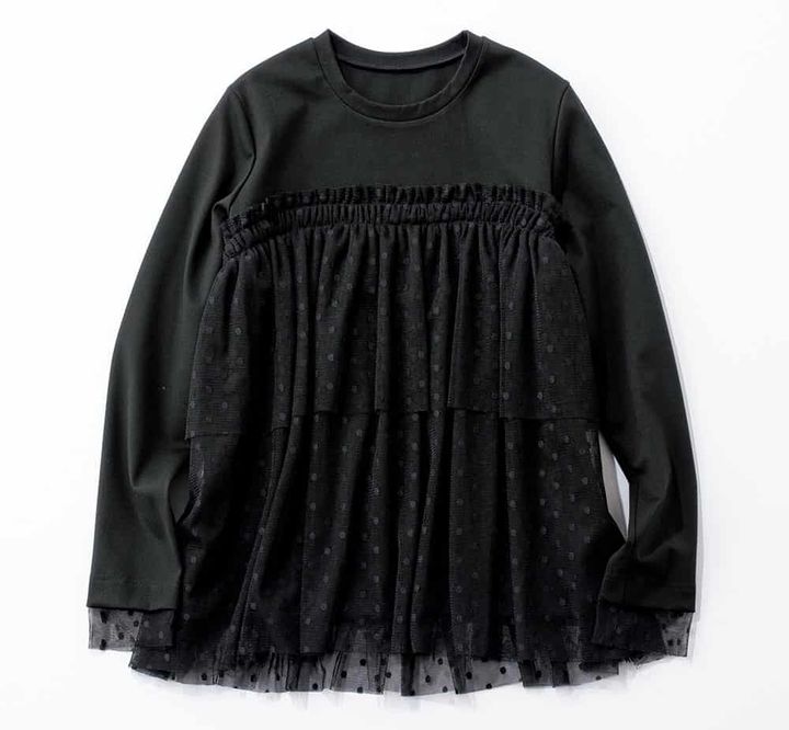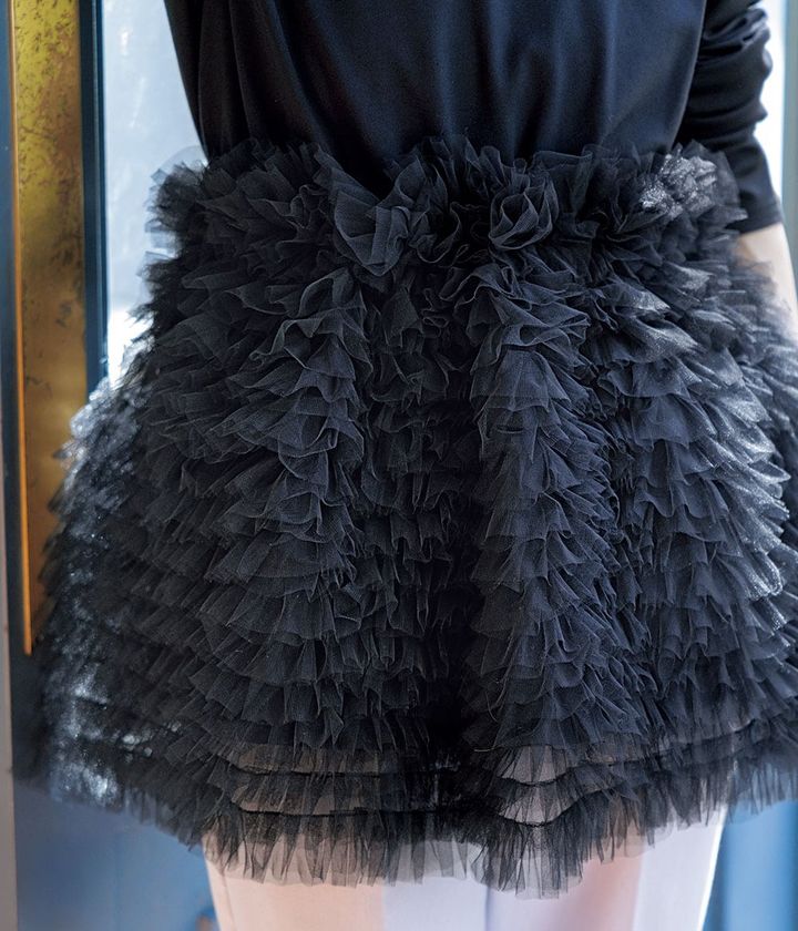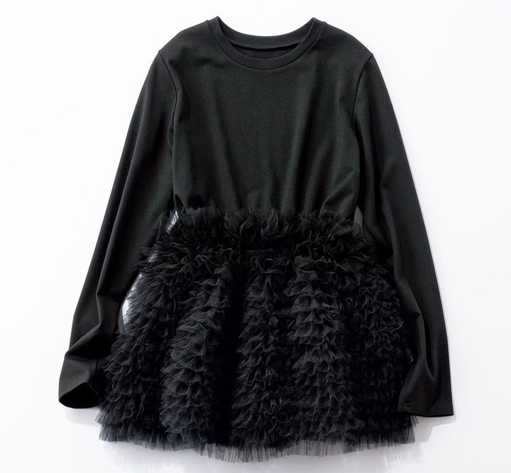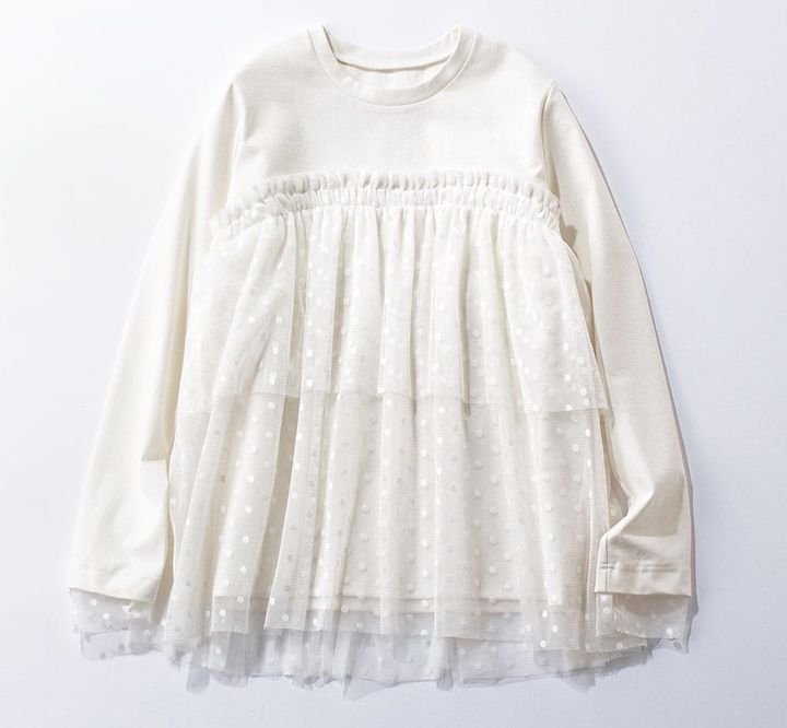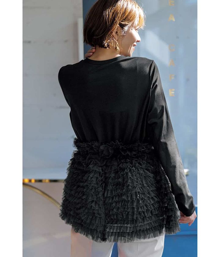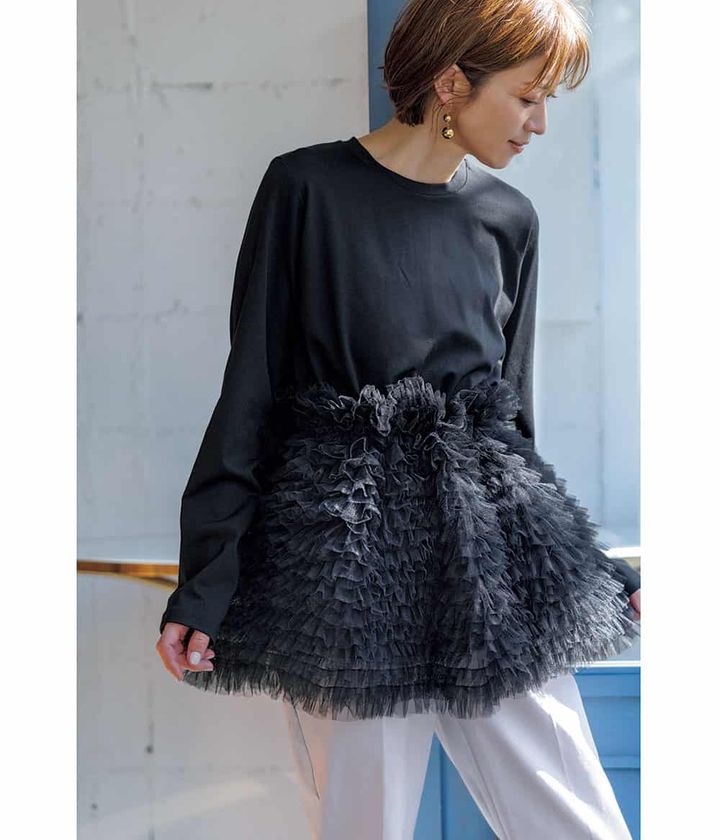 ボリュームが出すぎないように試着を重ね、この細かなフリルを採用しました。バレリーナのチュチュのような可愛さが特徴的なプルオーバーは、色もモノトーンで揃えています。ロングスリーブのTシャツ部分は薄手のポンチ素材を使用しているので体のシルエットを拾いにくいのがおすすめポイント。手洗いが可能です。