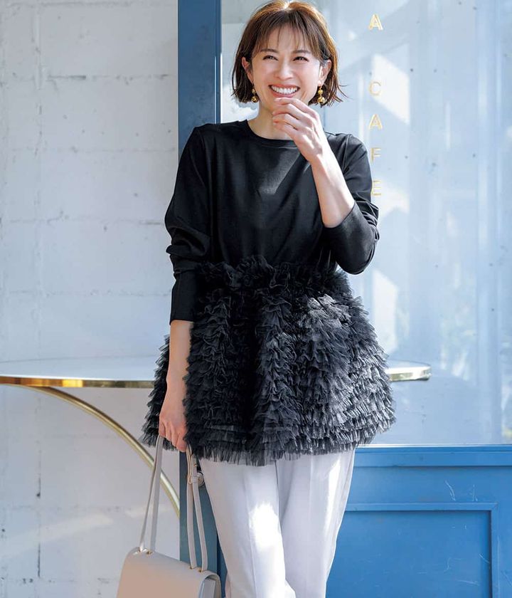 チュールフリルプルオーバー¥17,600(シークレット・トロフィー)パンツ¥17,600(Stola.)バッグ¥188,980(ミチノ・パリ/トゥモローランド)ピアス¥24,420(ベン・アムン/ズットホリック)