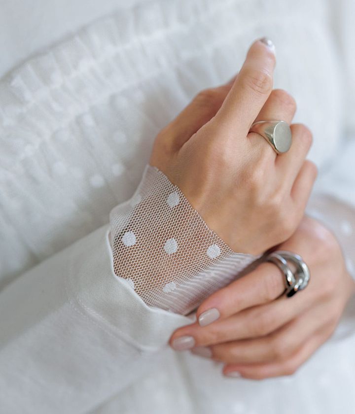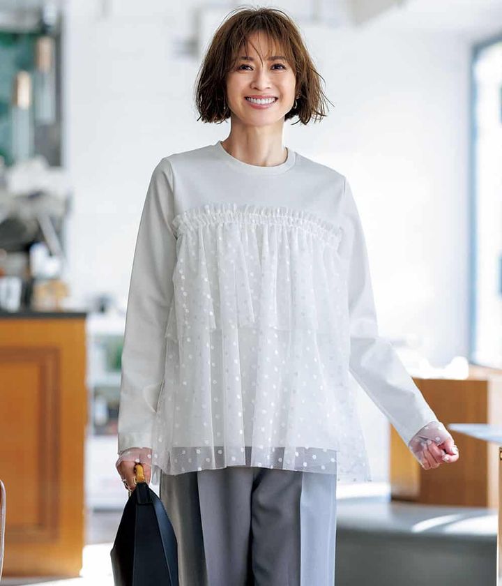 ドットチュールプルオーバー¥16,500(シークレット・トロフィー)パンツ¥17,600(イチエ/シュガー・マトリックス)バッグ¥49,500(オルセット/オルサ)ピアス¥3,850〈ヘンカ〉リング[左手]¥3,900〈soie〉リング[右手]¥13,200〈G.R〉(すべてロードス)