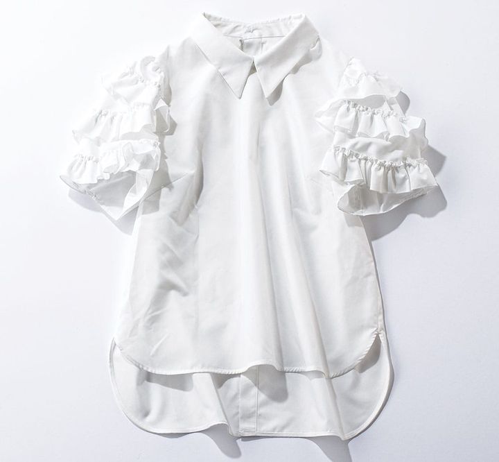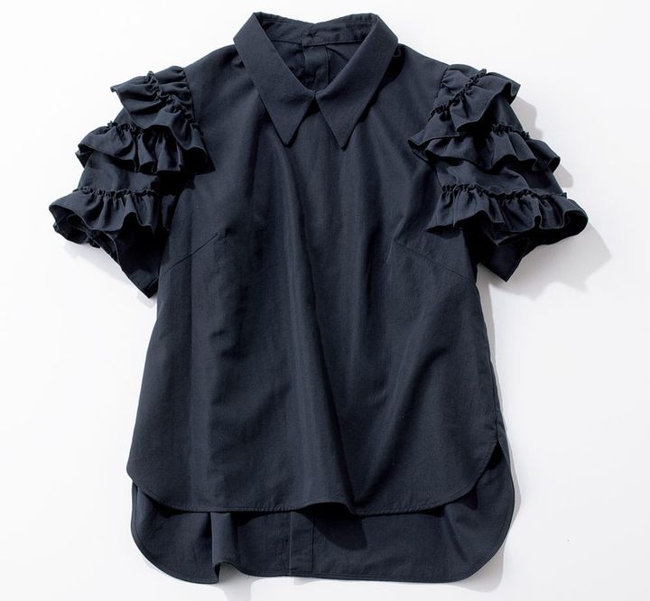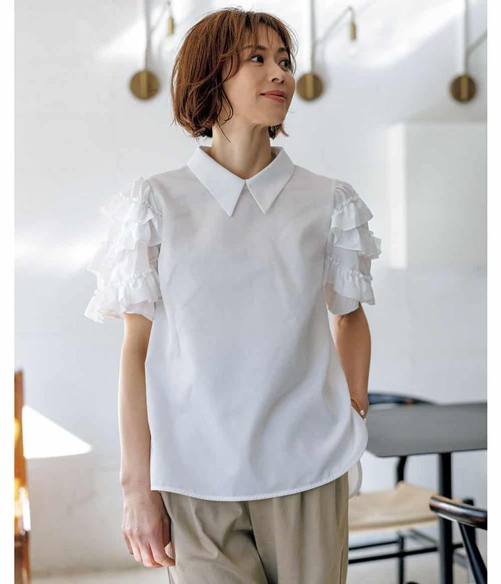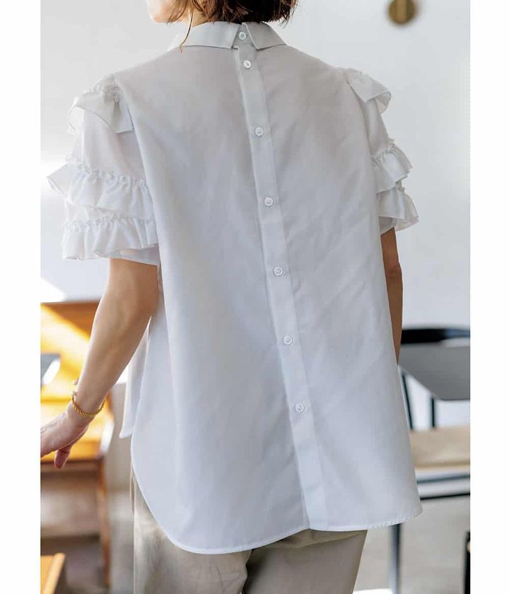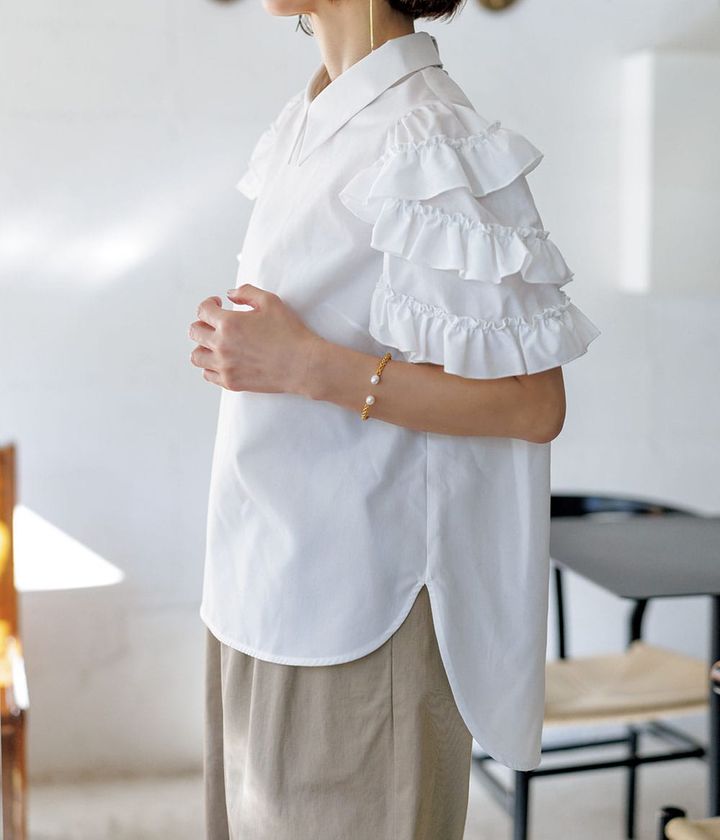 あえて衿でなく先衿を尖らせてシャープさをプラスしたフリル袖のブラウス。後ろボタンにして後ろ姿がシンプルになりすぎないように配慮しました。脇は前後差を付けてラウンドカットにし、アウトして着たときもスタイリングが決まるようになっています。きっと甘辛コーデをするときに頼れるブラウスになるはず。