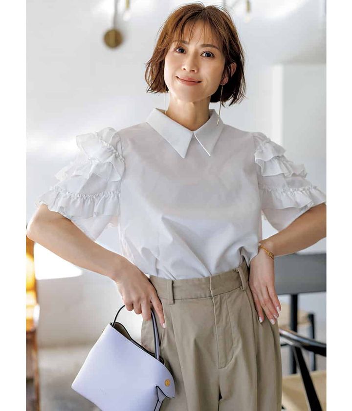 フリルスリーブブラウス¥17,600(シークレット・トロフィー)チノパンツ¥23,100(ティッカ)バッグ¥93,500(フルーロン/トゥモローランド)ピアス¥47,300(ココシュニック)バングル¥37,840(ジゼルベー/ズットホリック)
