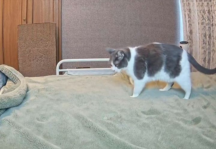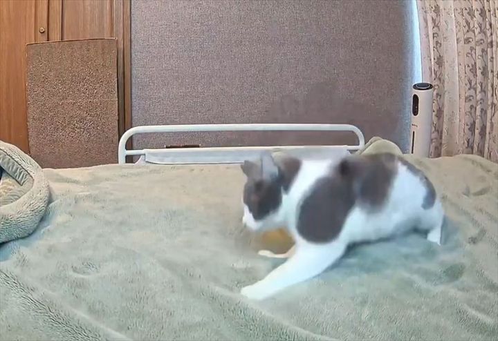 家を留守にしていた飼い主んが、家に設置していたカメラの映像を確認してみると、愛猫のうち『めい』くんがベッドの上に現れました。