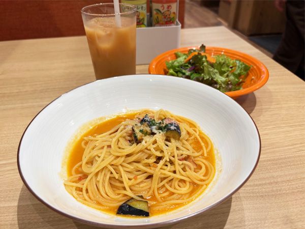 今回は、「おすすめセット」の「デイリーセット」を選ぶことにしました。パスタは「なすとベーコンのトマトクリームソース」に。