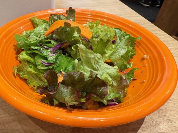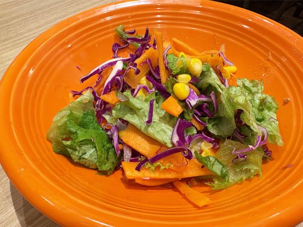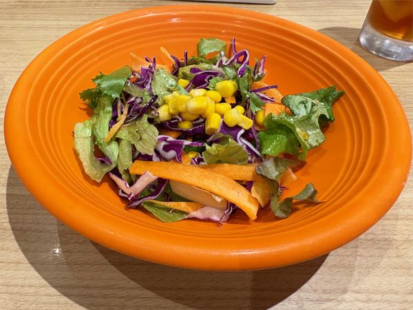 サラダは、グリーンレタスにトレビス、ニンジン、コーンがきれいに盛られていました。