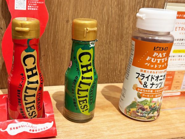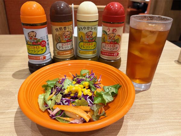 ドレッシングのラインアップは、ピエトロドレッシングの和風しょうゆ、焙煎香りごま、まろやかレモン、うめの4種。