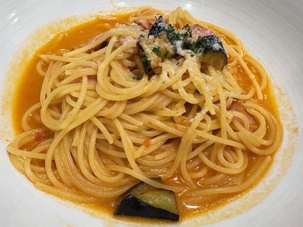 「なすとベーコンのトマトクリームソース」はさっぱりとした味わいでもりもり食べられます