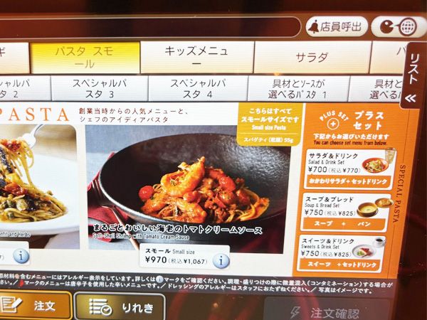 オーダーはタッチパネルで。単品はパスタの量が選べるのも魅力かも