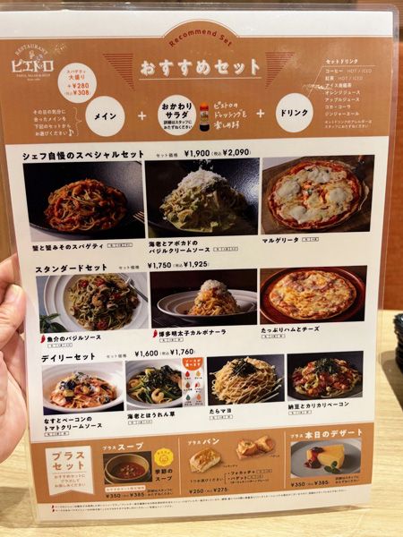 「おすすめセット」は、8種のパスタ、または2つのピザの中から選ぶと、おかわりサラダとドリンクが付きます。