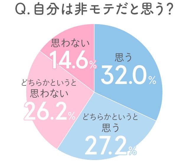 20〜30代の男性103名にアンケートを実施し、自分は非モテだと思うかを調査したところ、約6割が自身を非モテである、またはどちらかというと非モテであると感じていることが分かりました。特に「自分は『非モテ』だと思う」と感じている人が32.0%と最も多い割合を占めていました。