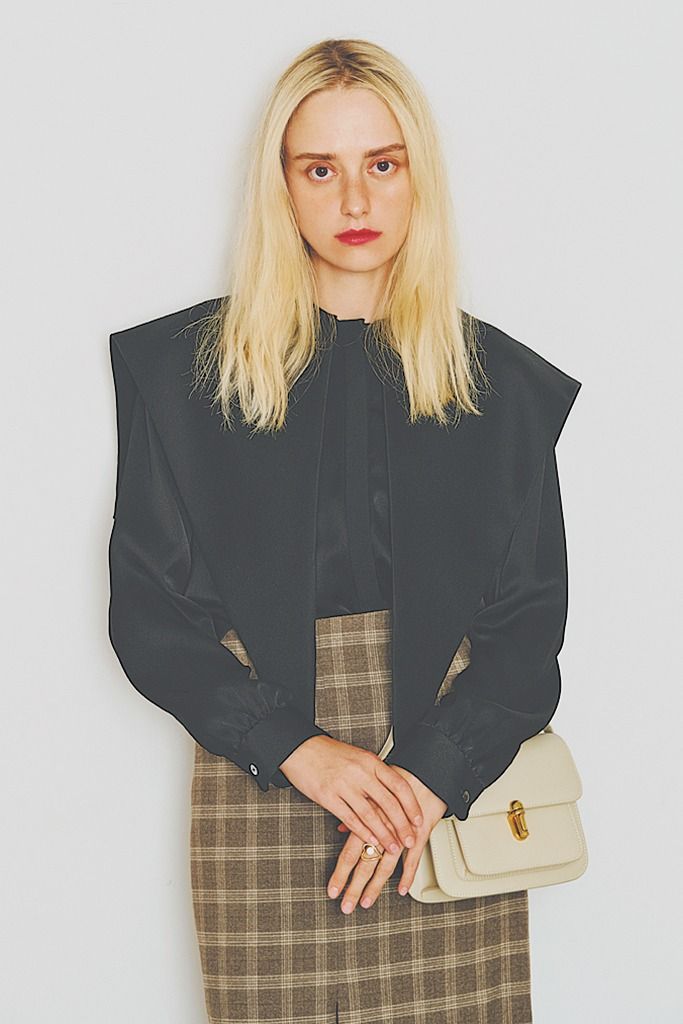 肩にアクセントを効かせた黒の場浦臼は、ミニマルながらも存在感抜群。滑らかな素材感が上品さを引き立て、どんなシーンにもマッチする万能アイテム。合わせたチェック柄スカートは、落ち着いたトーンで全体を引き締めつつ、クラシックな雰囲気をプラスした、シンプルな中にも程よい遊び心が感じられるコーディネート。ベージュのミニバッグは、全体のトーンを柔らかくまとめるアクセントとして活躍。ゴールドのリングでさりげなく華やかさを添えて。