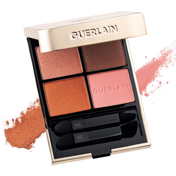 2つの質感の柔らかなピンクと温かみのあるオレンジブラウンが大人の目元に優しげな目力を。オンブル ジェ129 ハニーアンバー ¥10,780(ゲラン)