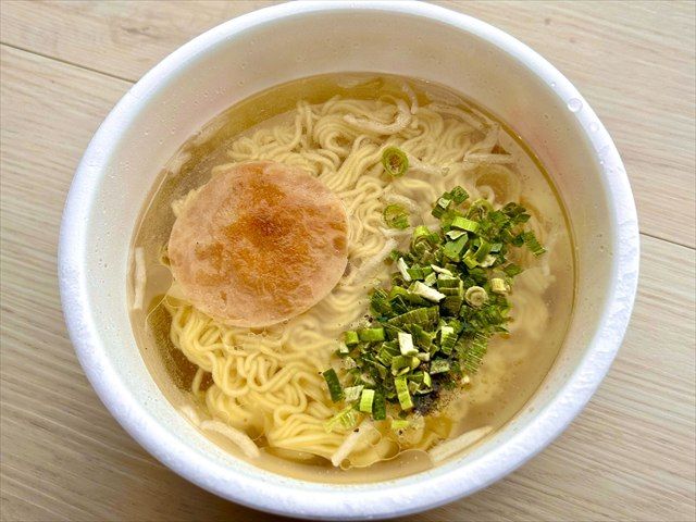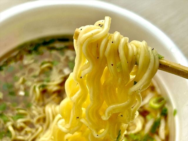 まさに黄金色のスープ。かやくに入っていたもやしもシャキシャキしており、いいアクセントになっています! また、モチモチ食感のノンフライ麺で、コシのある中細の麺とスープがよく絡みます。