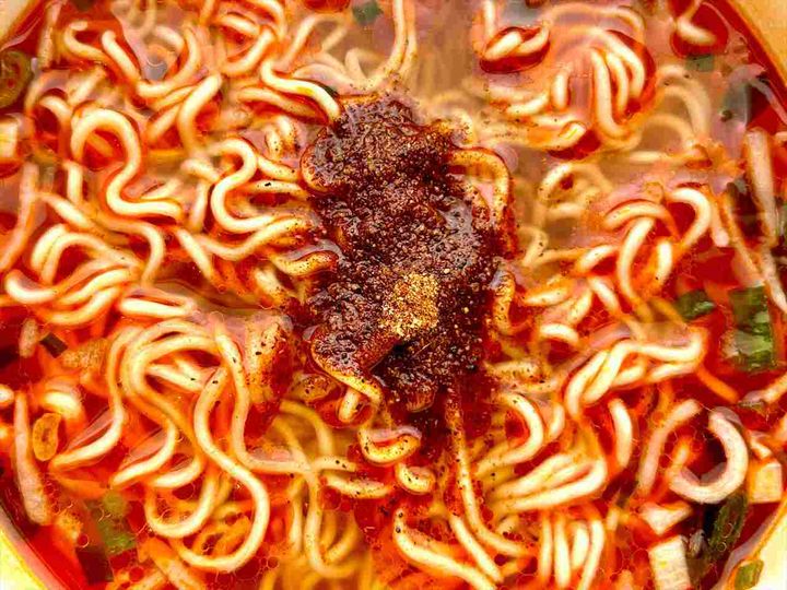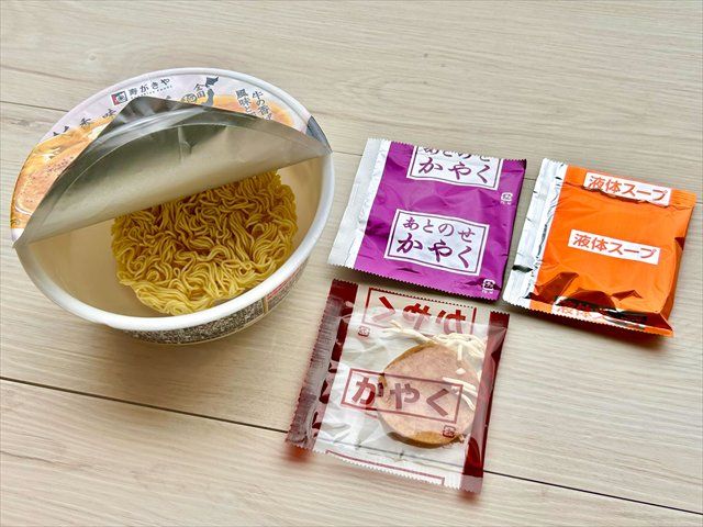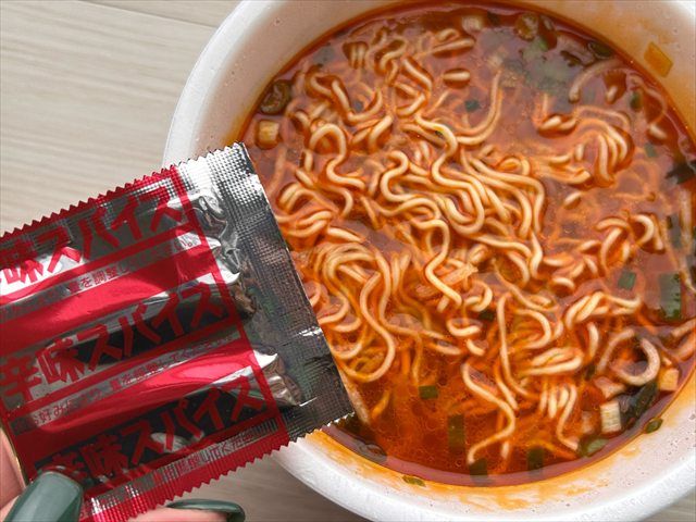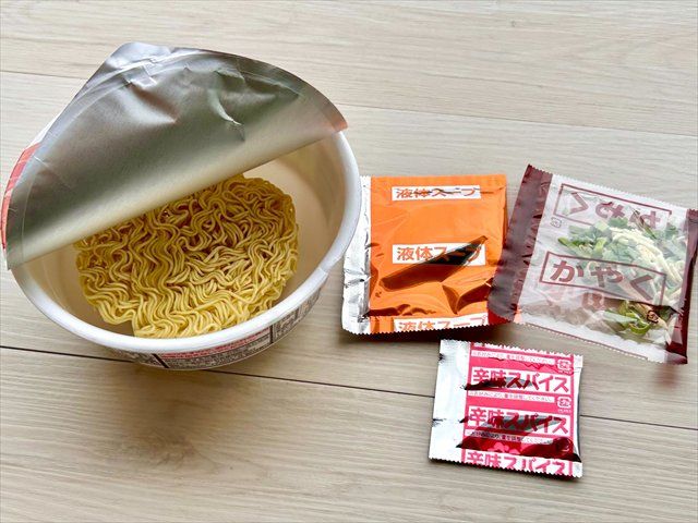 ふたを開けて中に入っている袋を取り出すと、「液体スープ」「かやく」とともに「辛味スパイス」なるものが。真っ赤なパッケージからして辛そう。