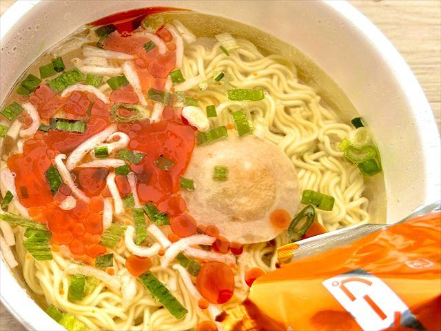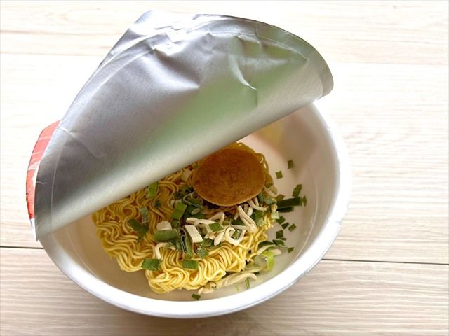 かやくのみを入れ、先程と同量のお湯を注ぎ、4分待ちます。