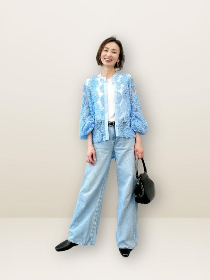 春らしい透け感が魅力のチュールデザインブラウスを主役にした軽やかさ抜群のコーデ。立体感のあるお花モチーフが華やぎを添え、シースルーの袖が抜け感を演出します。トップスは前後アシンメトリーな丈感で動きのあるデザイン。インナーにシンプルなタンクトップを仕込めば甘すぎずにこなれた印象を叶えます。デニムはワイドでゆるっとした大人のリラックス感をプラスしました。