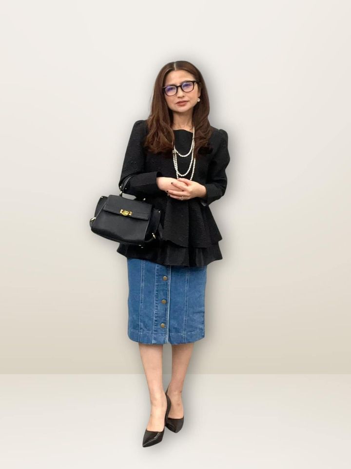 大人の上品さとカジュアルのバランスが絶妙なデニムタイトスカートコーデ。トップスはペプラムシルエットの華やかデザインでシンプルなデニムに程よい甘さをプラス。スクエアネックがデコルテを美しく見せ、パールアクセが全体をエレガントに格上げ。小物はブラックで統一することで上品な大人の余裕を演出。オフィスや食事会などの程よく華やかさが欲しいシーンに最適なスタイルです。