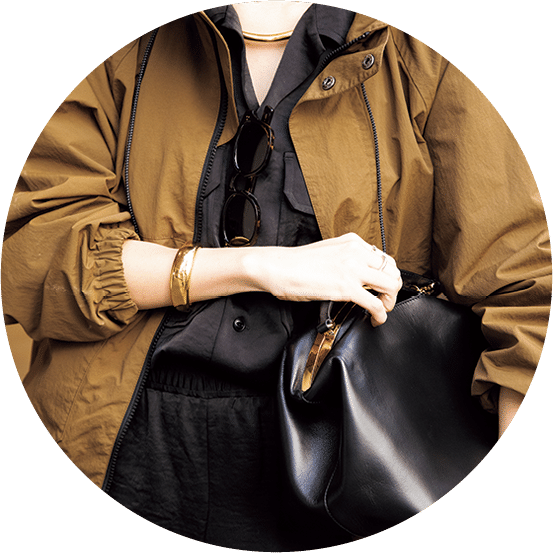 レザーバッグ、ゴールドジュエリーを着けることでカジュアルムードを緩和。