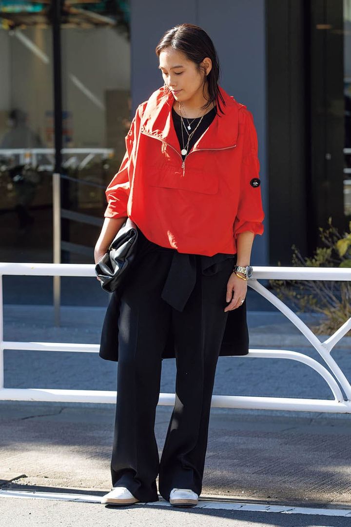 「パンツとセットアップのテーラードジャケットを腰巻きにし、都会に溶け込むスタイルに。スポーティなアイテムを着るときは、ツヤっぽい小物を取り入れ、色を使い過ぎないようにします」