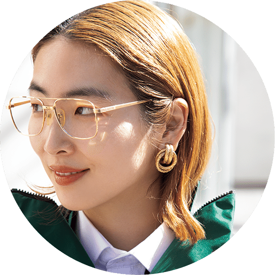 メタリックな眼鏡、大ぶりのゴールドジュエリーで顔まわりを華やかに。